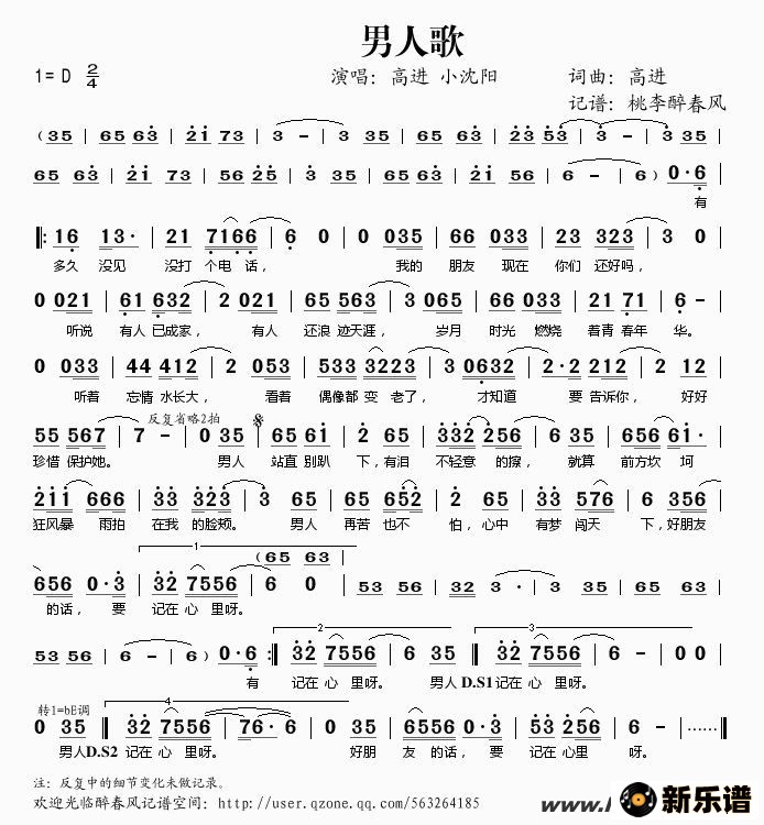高进/小沈阳演唱的男人歌歌词,男人歌简谱.