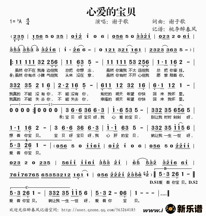 《心爱的宝贝》简谱 谢子歌-桃李醉春风制谱