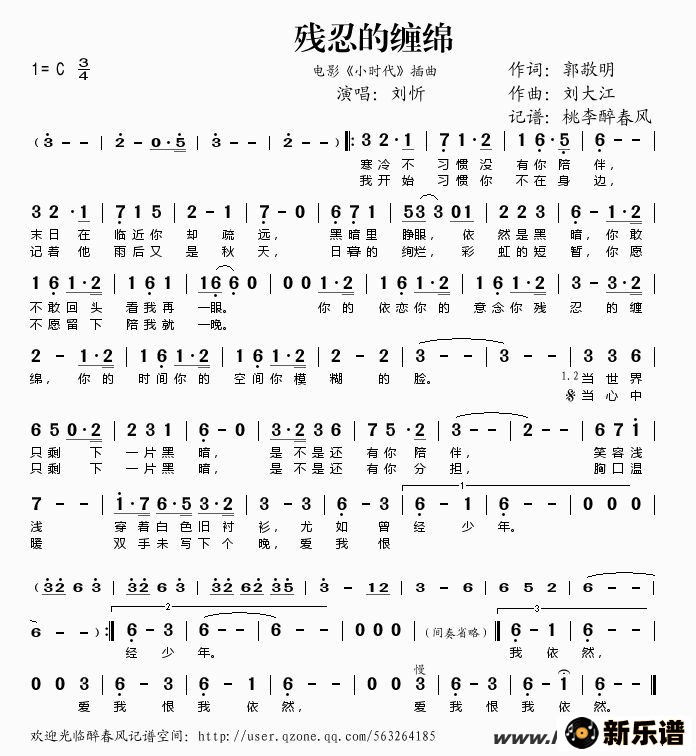刘忻演唱的残忍的缠绵(电影《小时代》插曲)歌词,残忍的缠绵(电影《小时代》插曲)简谱.