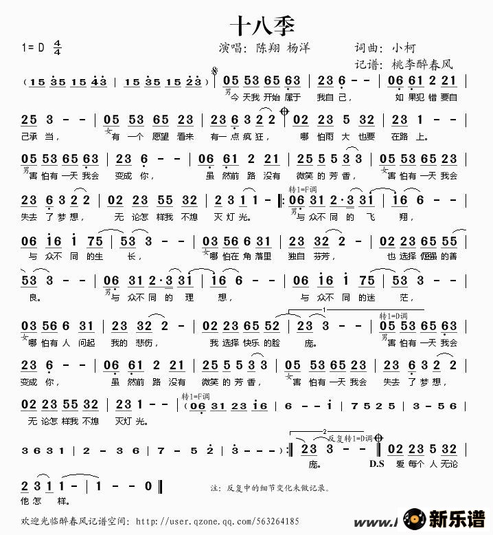 陈翔、杨洋演唱的十八季歌词,十八季简谱.