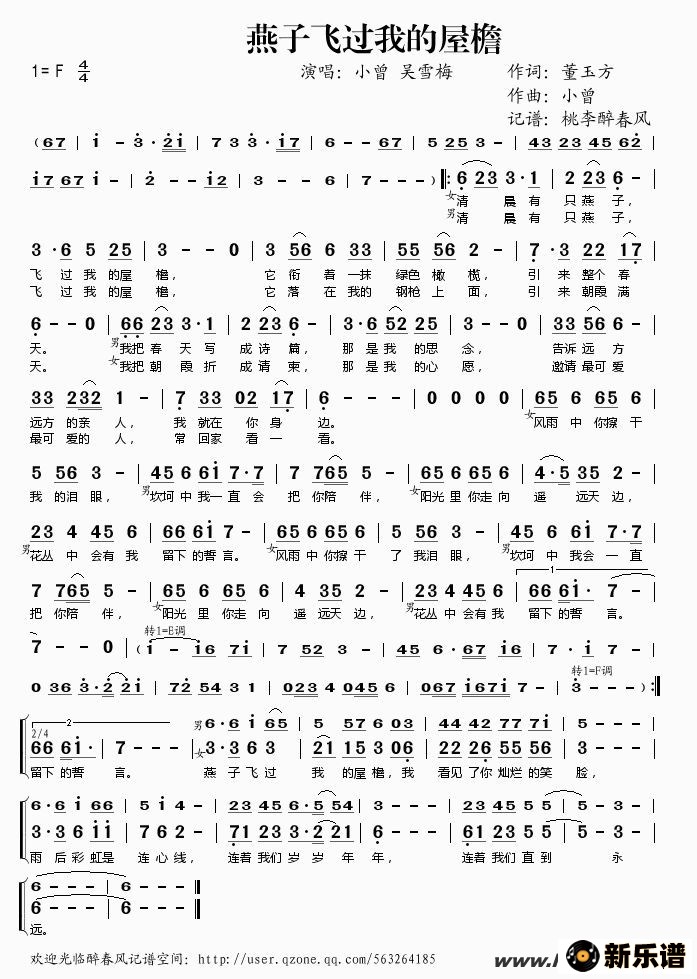 《燕子飞过我的屋檐》简谱 小曾/吴雪梅-桃李醉春风制谱