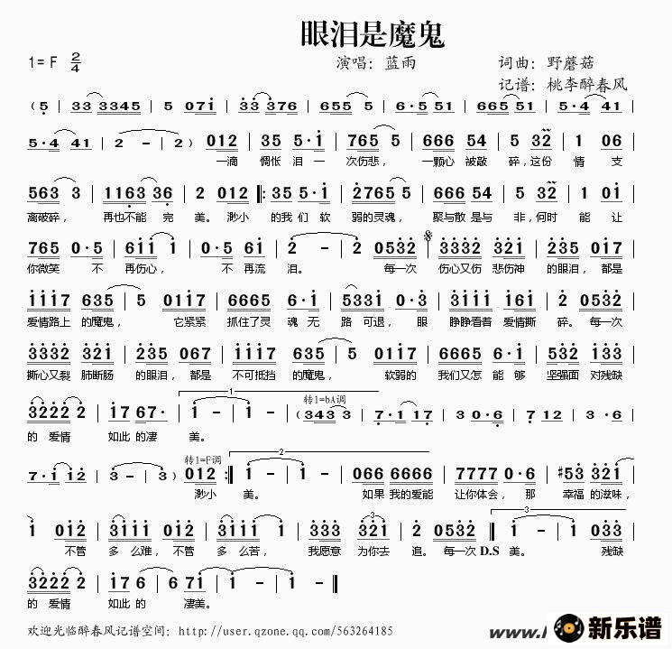 蓝雨演唱的眼泪是魔鬼歌词,眼泪是魔鬼简谱.