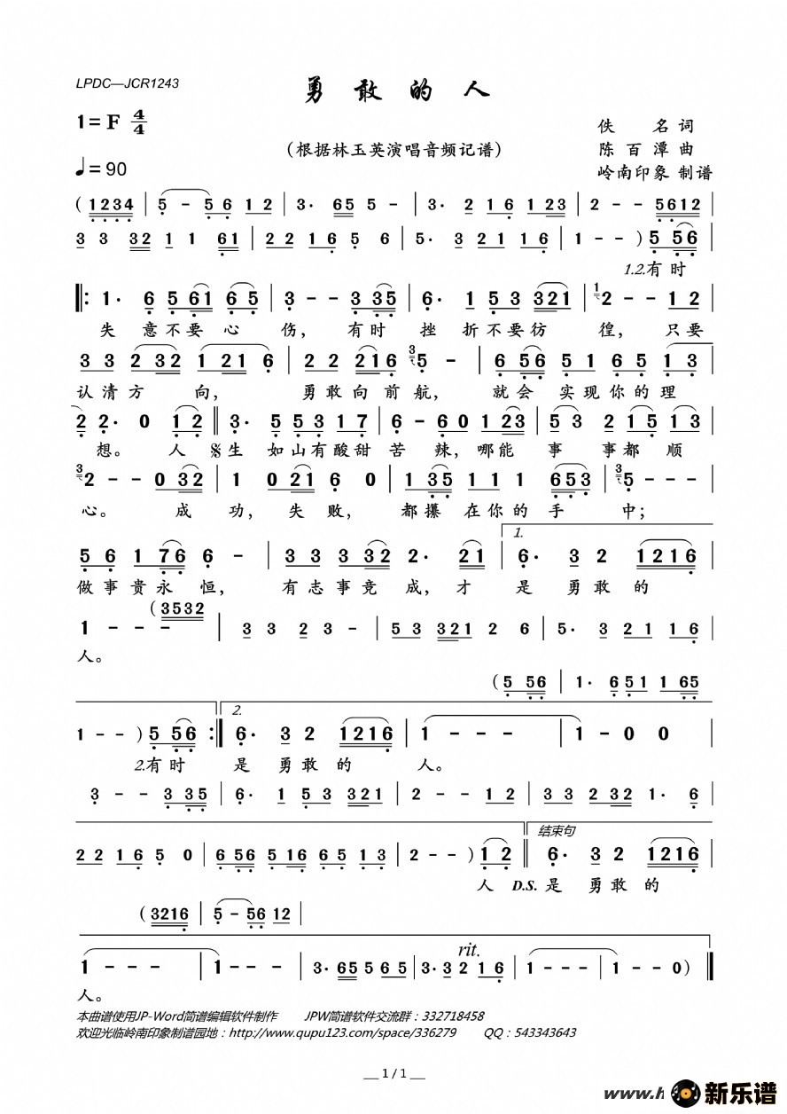 林玉英演唱的勇敢的人歌词,勇敢的人简谱.
