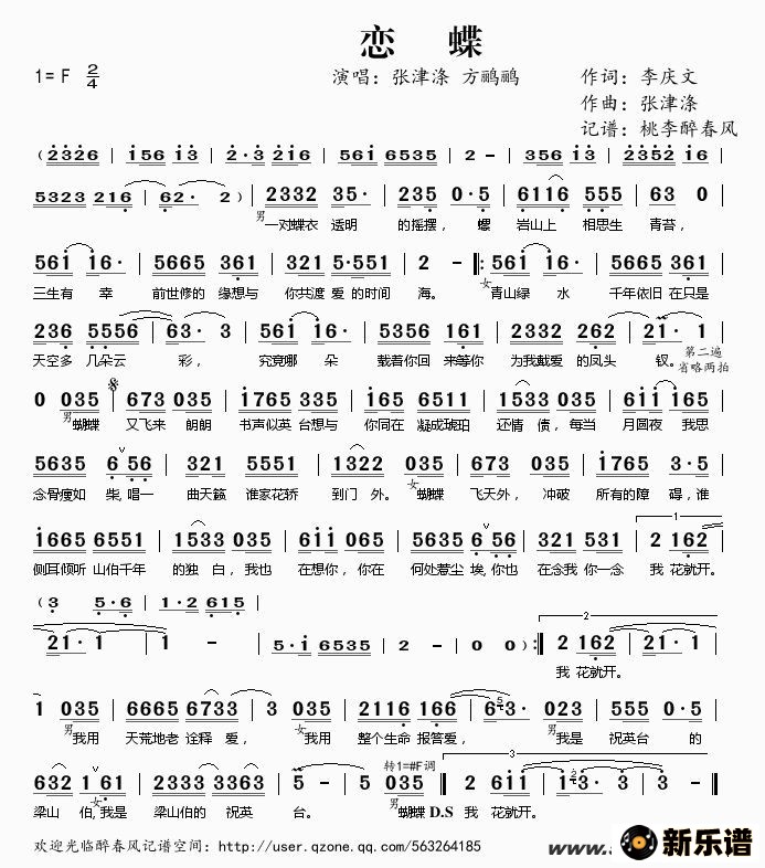 张津涤/方鹂鹂演唱的恋蝶歌词,恋蝶简谱.