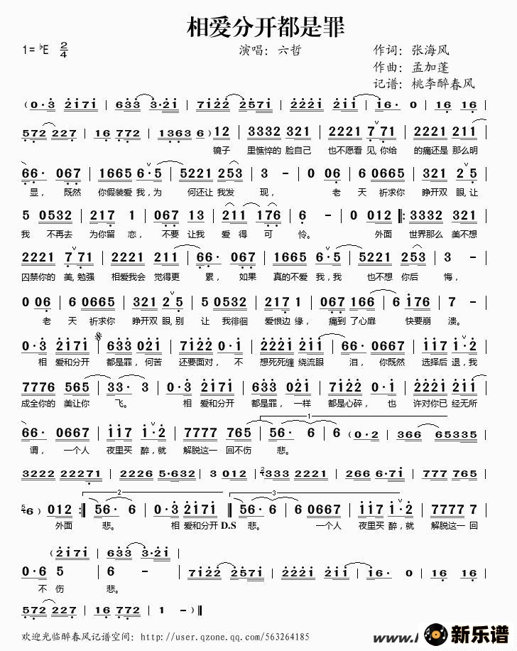 六哲演唱的相爱分开都是罪歌词,相爱分开都是罪简谱.