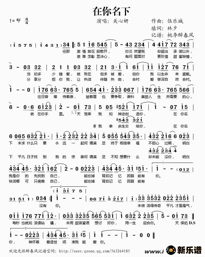 《在你名下》简谱 关心妍-桃李醉春风制谱
