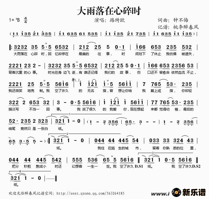《大雨落在心碎时》简谱 路绮欧-桃李醉春风制谱