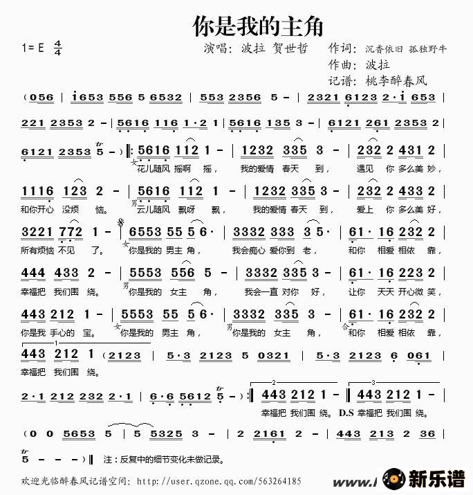 《你是我的主角》简谱 波拉、贺世哲-桃李醉春风制谱