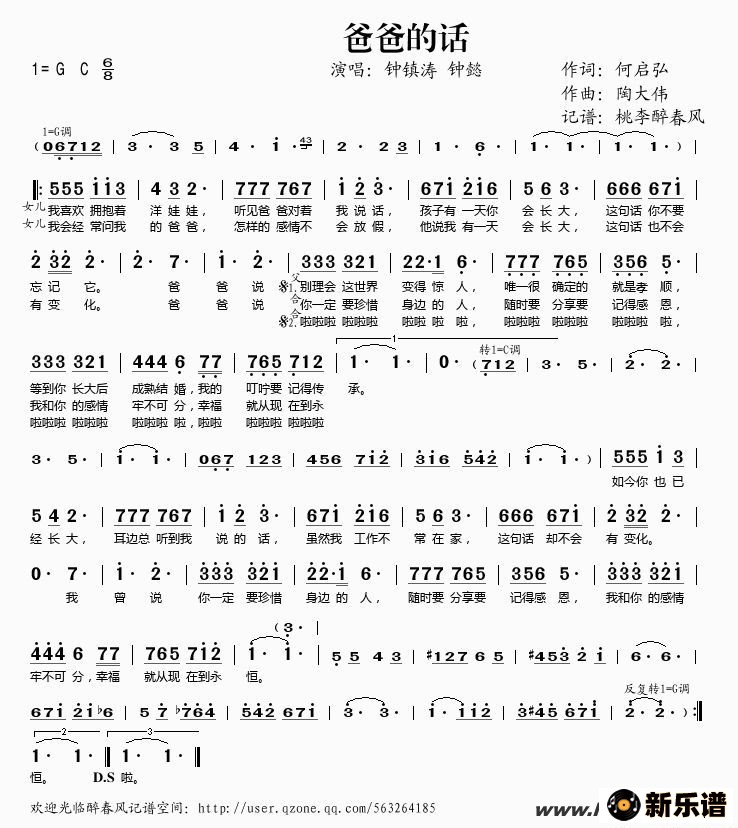 钟镇涛、钟懿演唱的爸爸的话歌词,爸爸的话简谱.