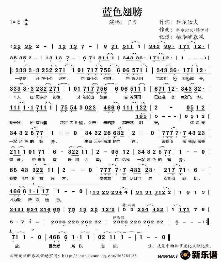 《蓝色翅膀》简谱 丁当-桃李醉春风制谱
