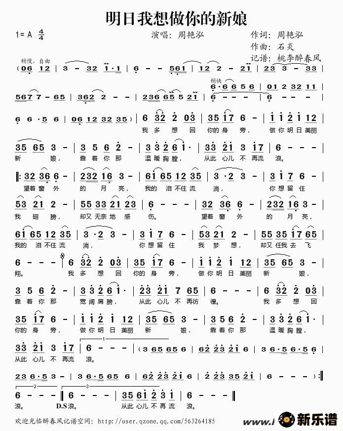 明日我想做你的新娘周艳泓 周艳泓演唱的明日我想做你的新娘歌词,明日我想做你的新娘简谱. 作词:周艳泓作曲:石炎演唱:周艳泓我多想回你的身旁做你明日美丽新娘靠着你那温暖胸膛从此心儿不再流浪望着窗外的月亮我的泪不住流淌你想留住我翅膀却又无奈地感伤望着窗外的月亮我的泪不住流淌你想留住我梦想却又任我去飞翔从此心儿不再彷徨 此简谱由新乐谱会员 桃李醉春风 上传