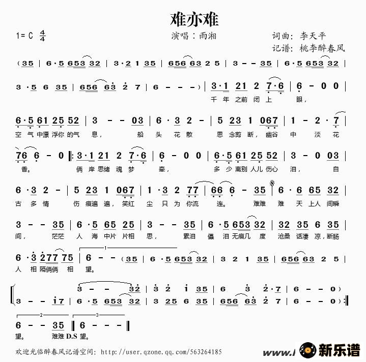 雨湘演唱的难亦难歌词,难亦难简谱.