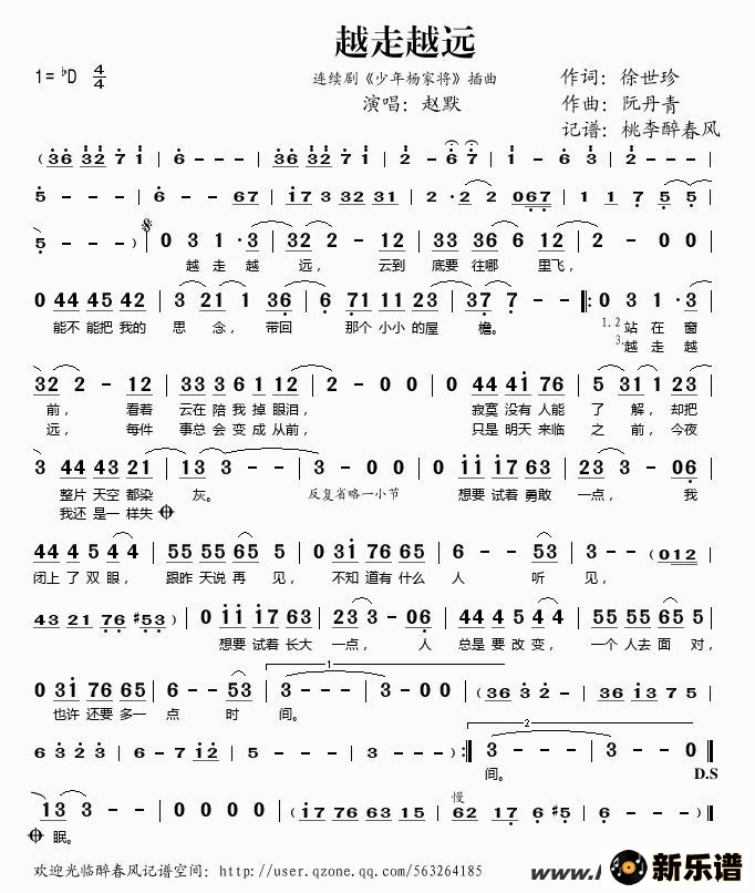 赵默演唱的越走越远(连续剧《少年杨家将》插曲)歌词,越走越远(连续剧《少年杨家将》插曲)简谱.