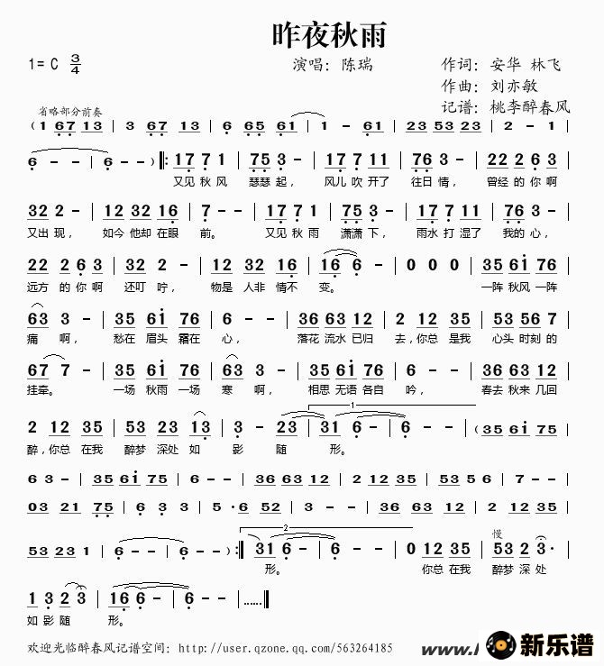 《昨夜秋雨》简谱 陈瑞-桃李醉春风制谱