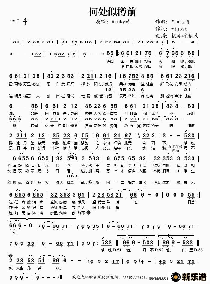 Winky诗演唱的何处似樽前歌词,何处似樽前简谱.