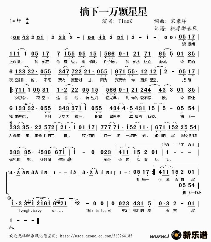 TimeZ演唱的摘下一万颗星星歌词,摘下一万颗星星简谱.