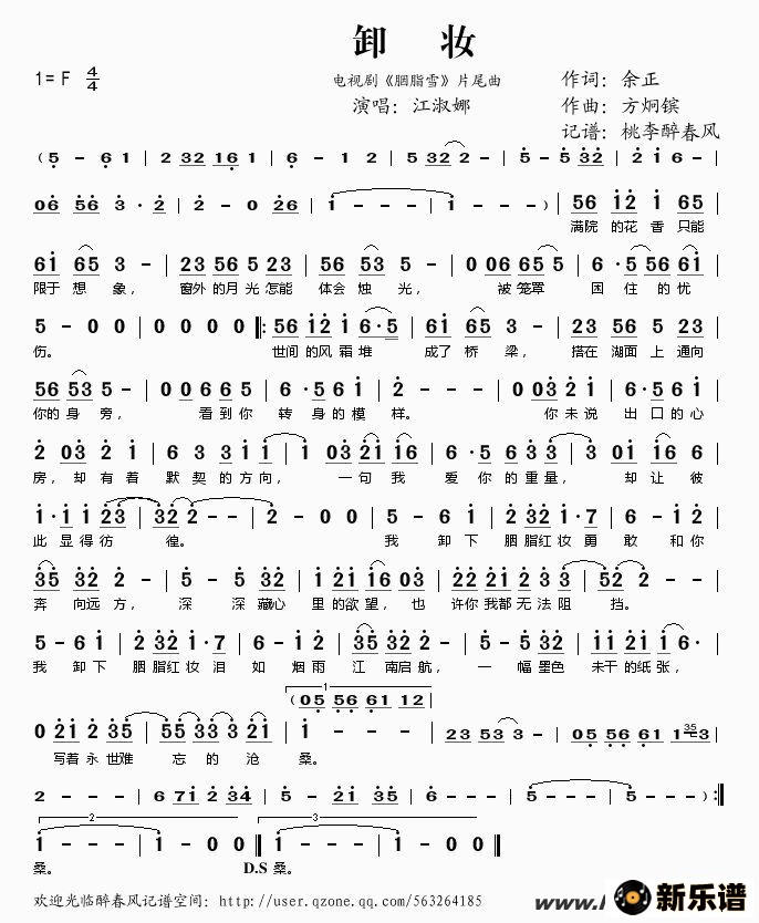 江淑娜演唱的卸妆(电视剧《胭脂雪》片尾曲)歌词,卸妆(电视剧《胭脂雪》片尾曲)简谱.