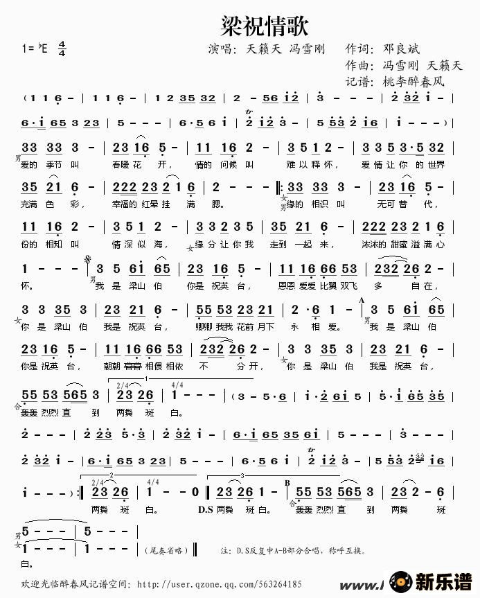 天籁天/冯雪刚演唱的梁祝情歌歌词,梁祝情歌简谱.