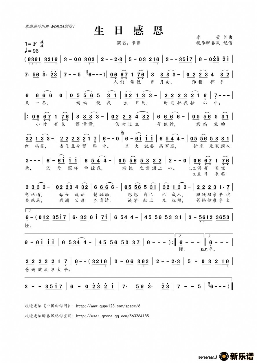《生日感恩》简谱 李萱-桃李醉春风制谱