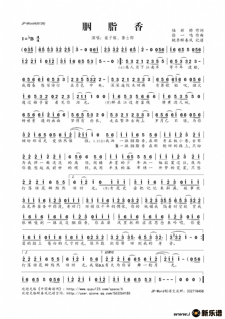崔子格/鲁士郎演唱的胭脂香歌词,胭脂香简谱.