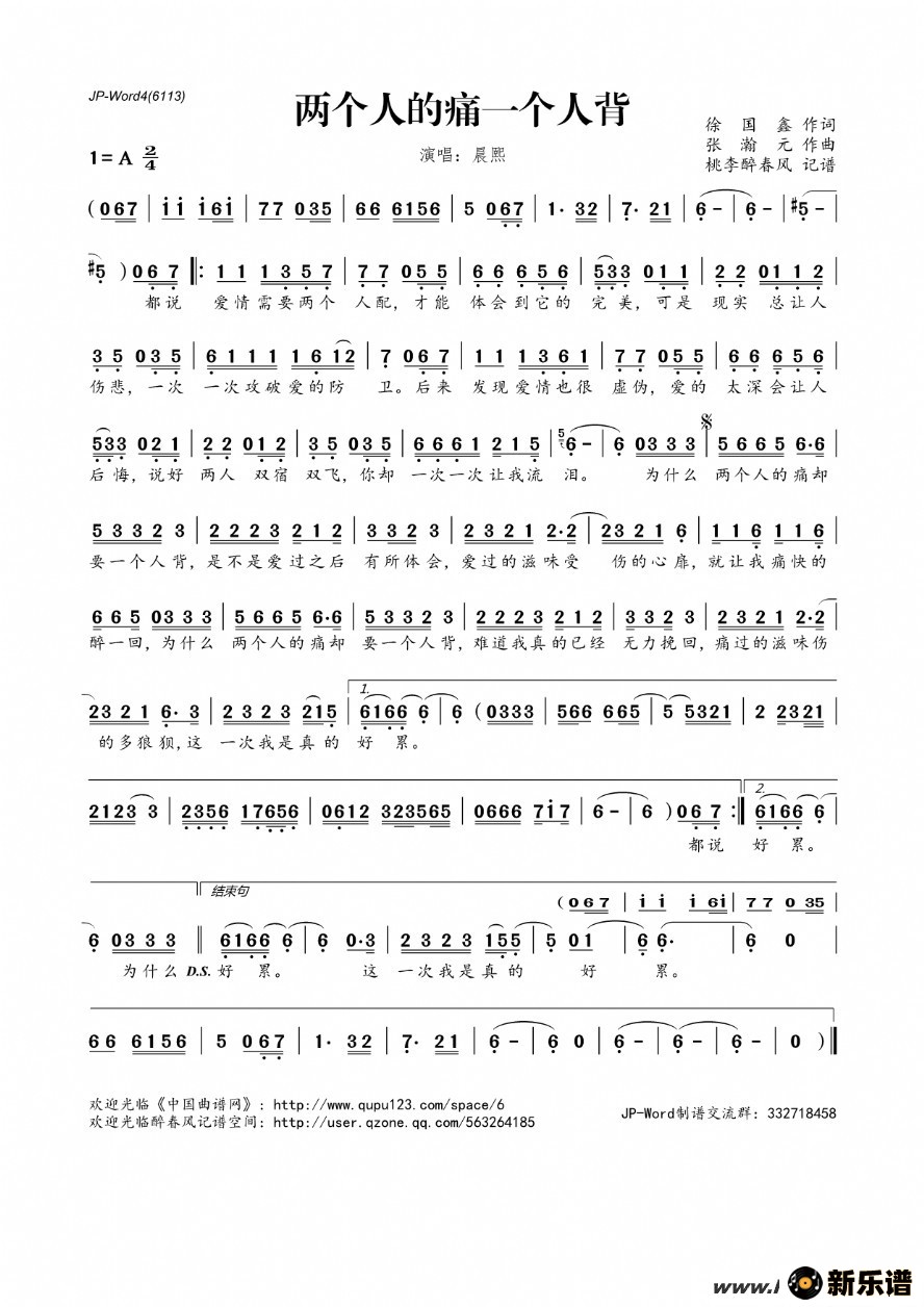 《两个人的痛一个人背》简谱 晨熙-桃李醉春风制谱