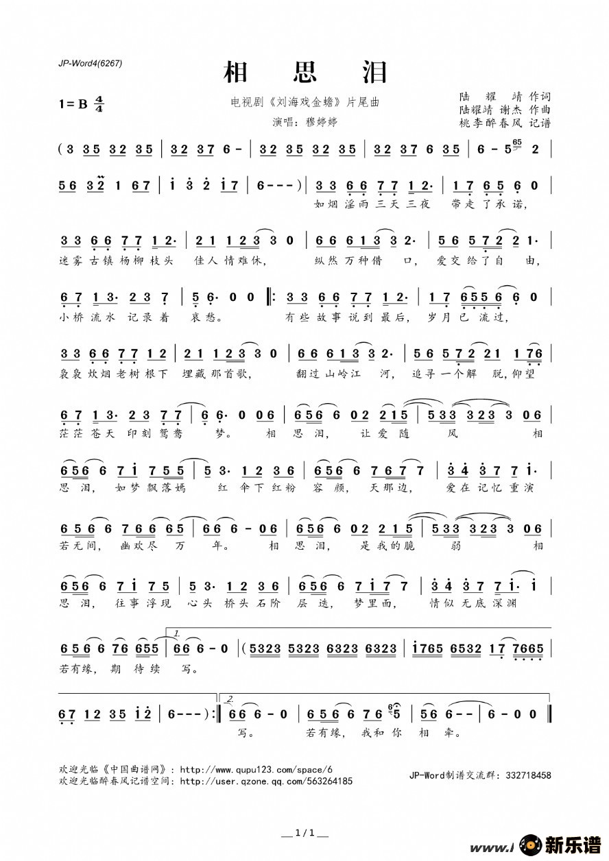 穆婷婷演唱的相思泪(电视剧《刘海戏金蟾》片尾曲)歌词,相思泪(电视剧《刘海戏金蟾》片尾曲)简谱.