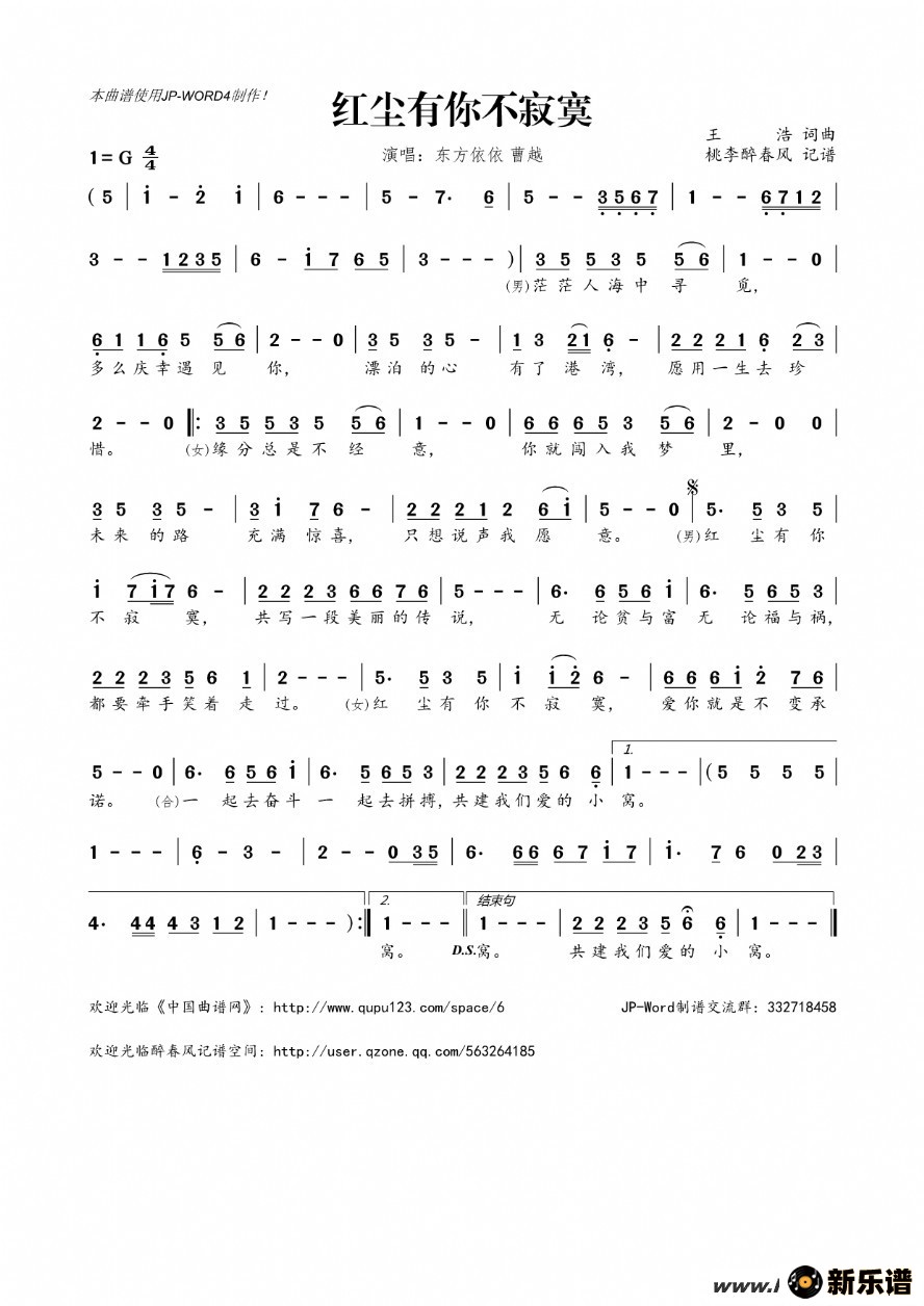 《红尘有你不寂寞》简谱 东方依依 曹越-桃李醉春风制谱