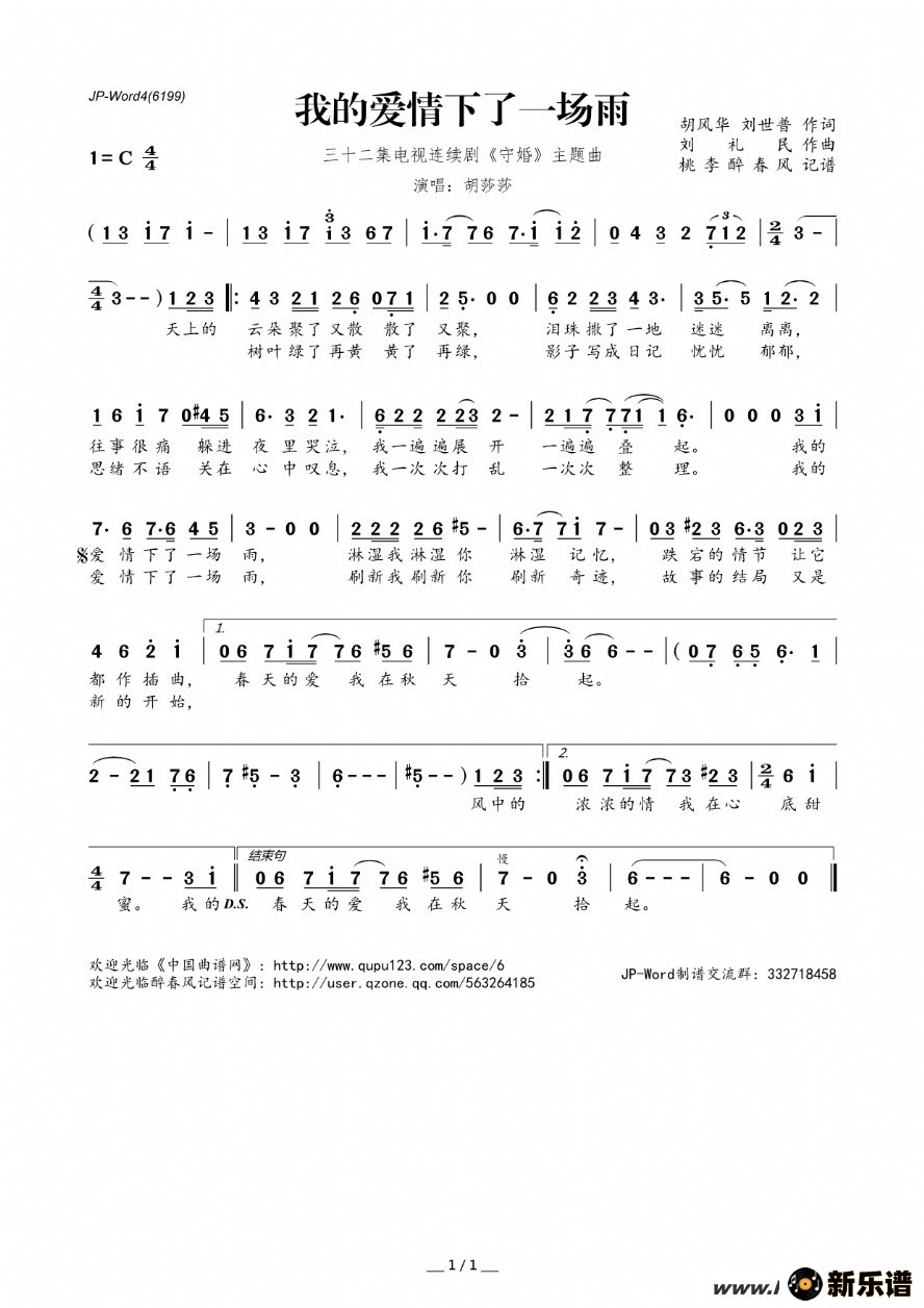 我的爱情下了一场雨(32集电视连续剧《守婚》主题曲)胡莎莎 胡莎莎演唱的我的爱情下了一场雨(32集电视连续剧《守婚》主题曲)歌词,我的爱情下了一场雨(32集电视连续剧《守婚》主题曲)简谱. 此简谱由新乐谱会员 桃李醉春风 上传