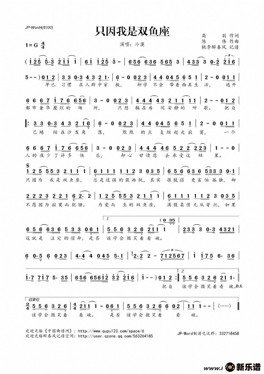 《只因我是双鱼座》简谱 冷漠-桃李醉春风制谱