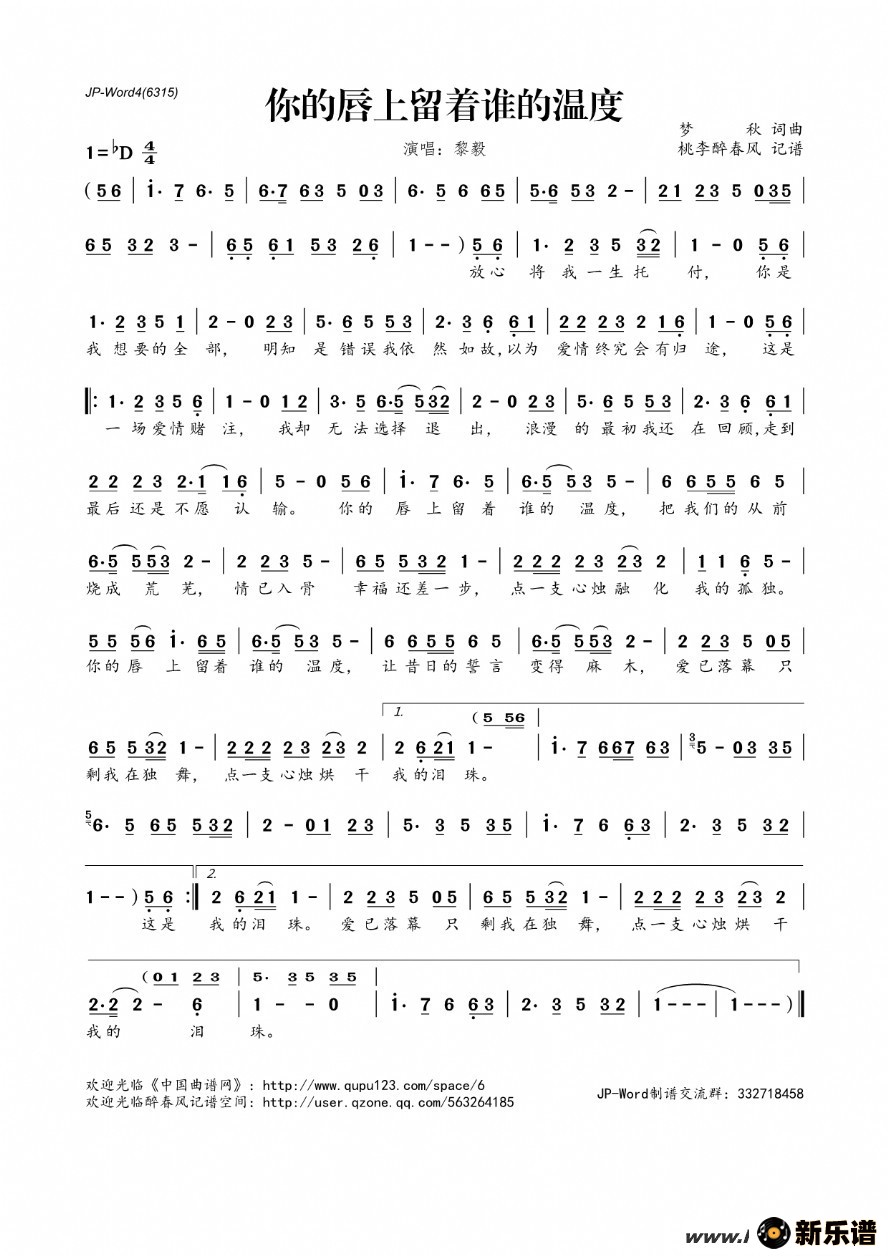《你的唇上留着谁的温度》简谱 黎毅-桃李醉春风制谱