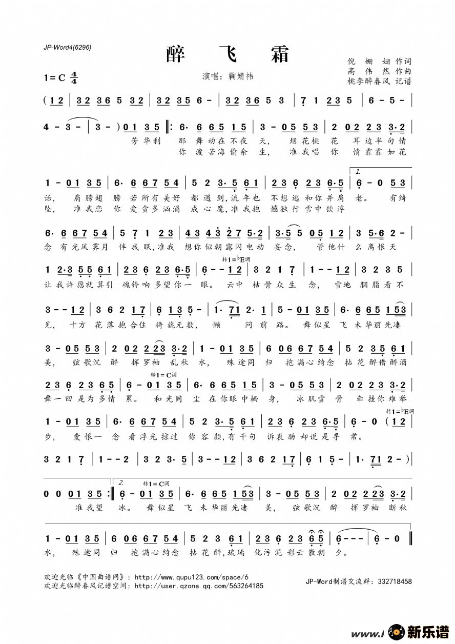 鞠婧祎演唱的醉飞霜歌词,醉飞霜简谱.