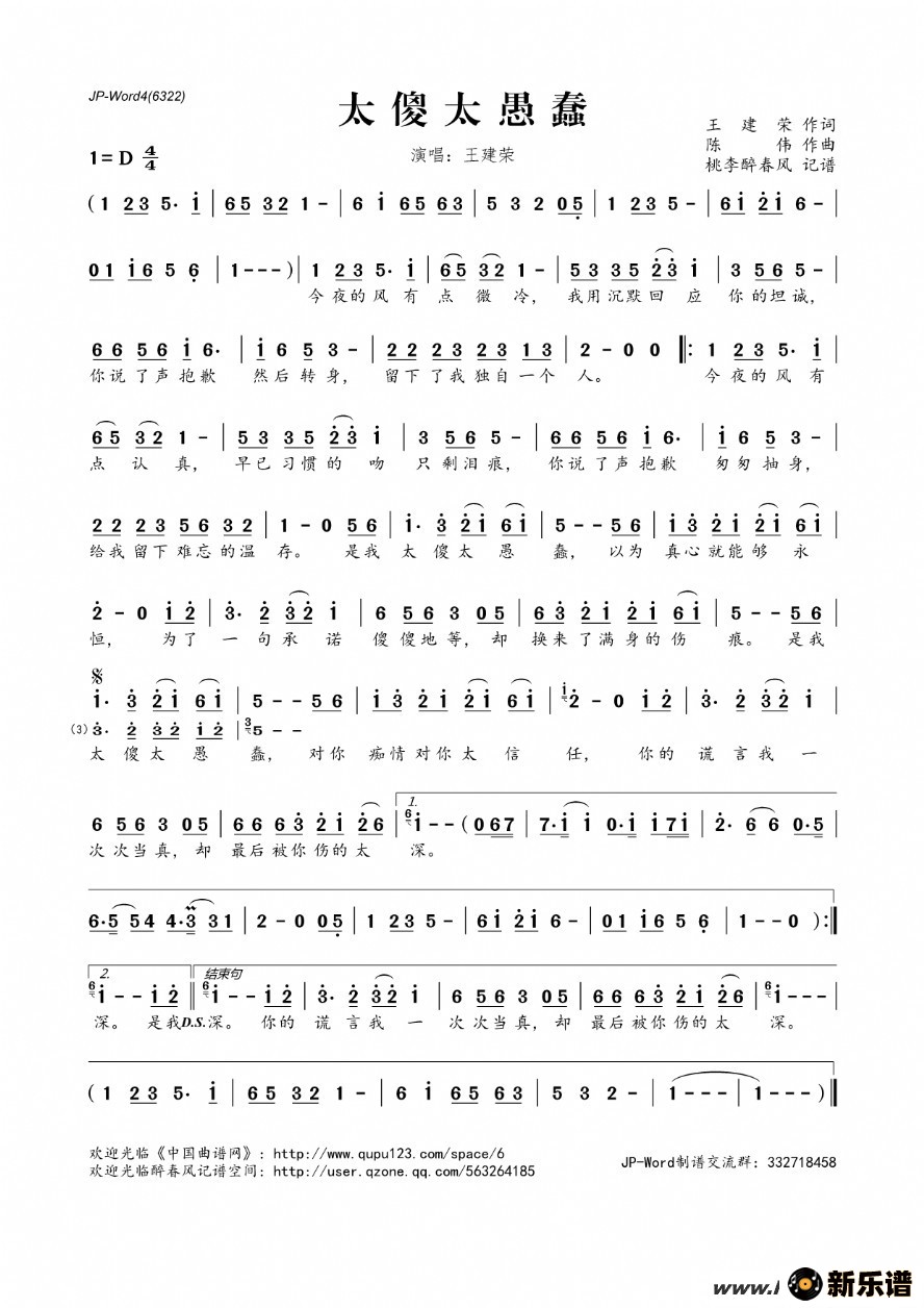 王建荣演唱的太傻太愚蠢歌词,太傻太愚蠢简谱.