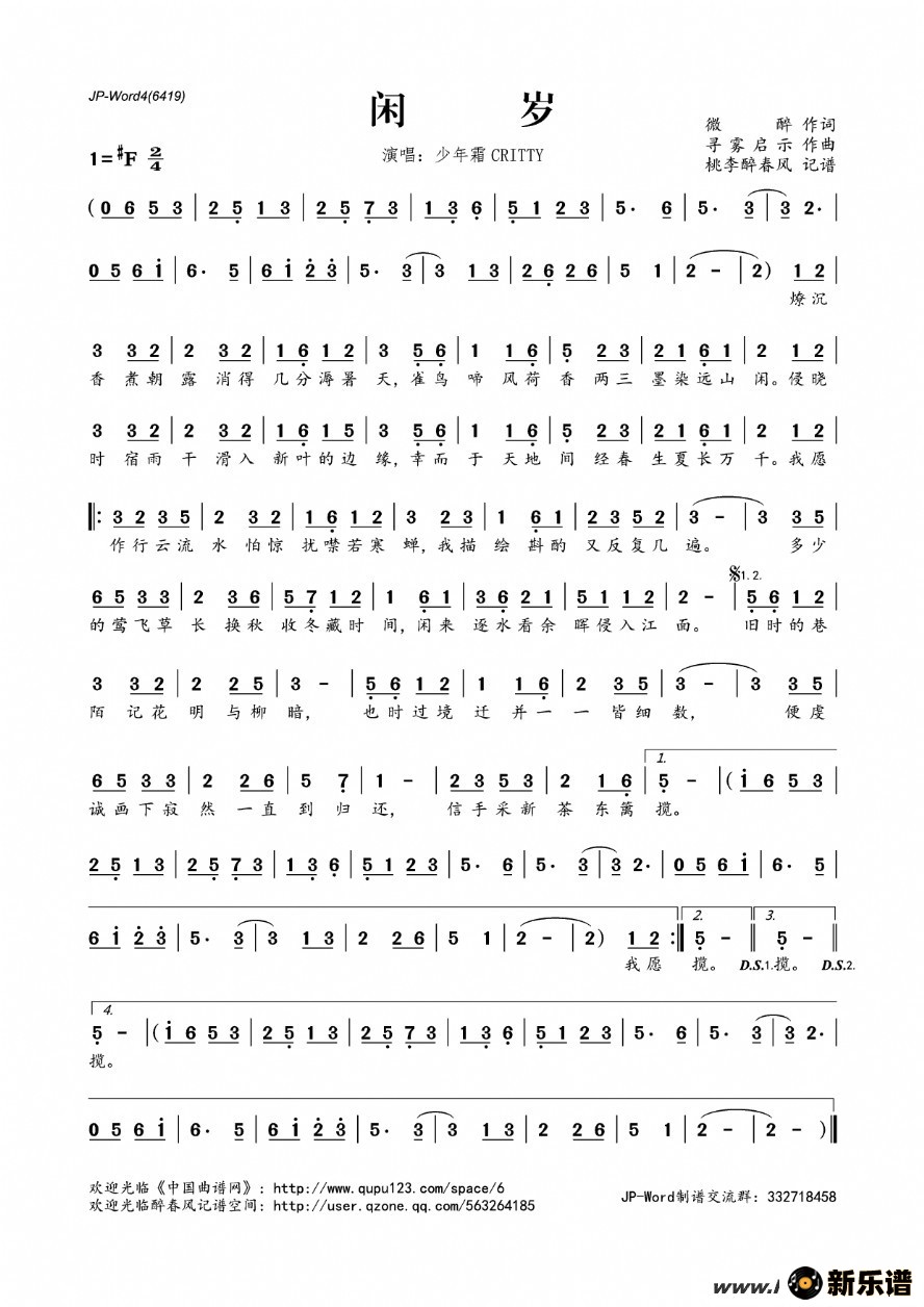《闲岁》简谱 少年霜/critty-桃李醉春风制谱