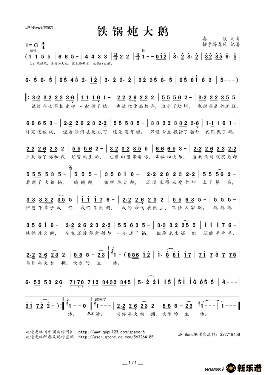 李虹强演唱的铁锅炖大鹅歌词,铁锅炖大鹅简谱.