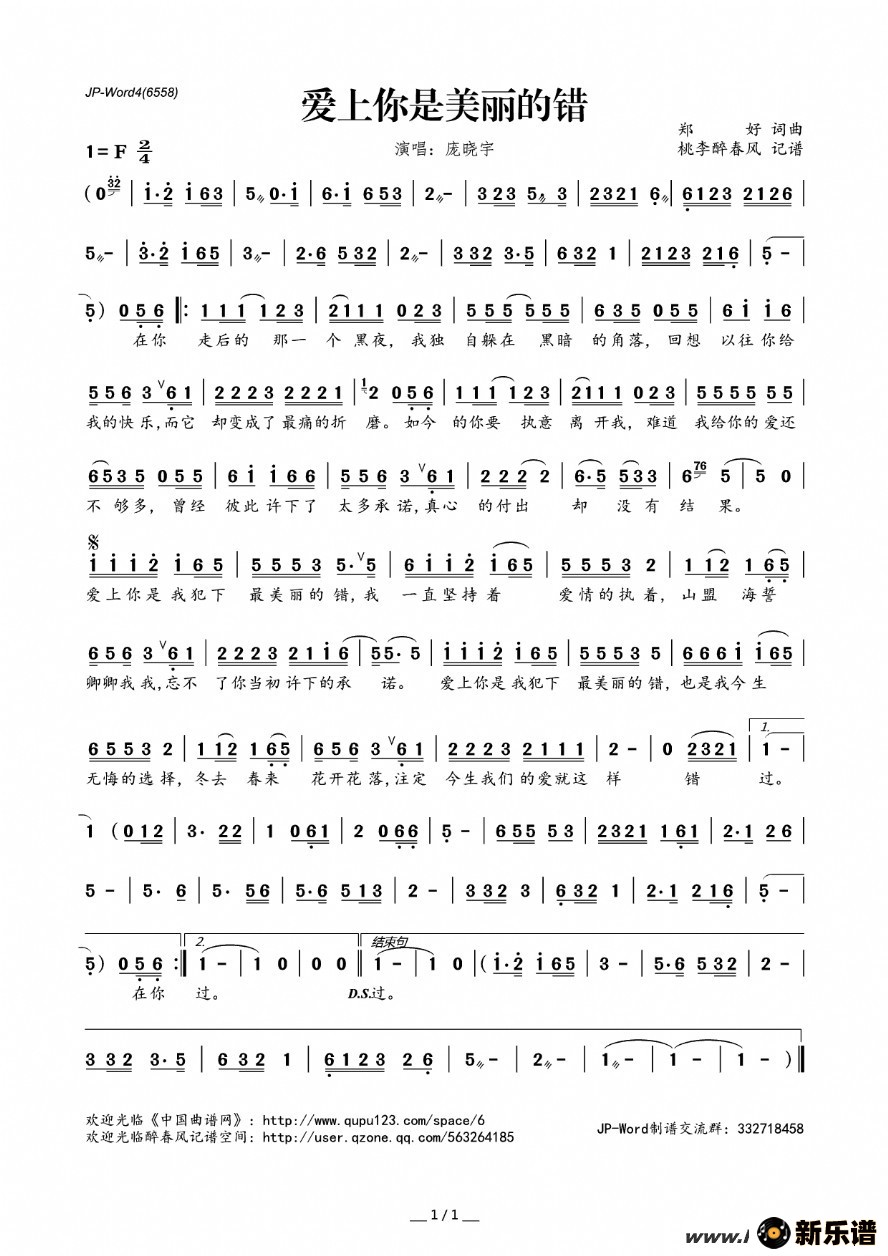 《爱上你是美丽的错》简谱 庞晓宇-桃李醉春风制谱