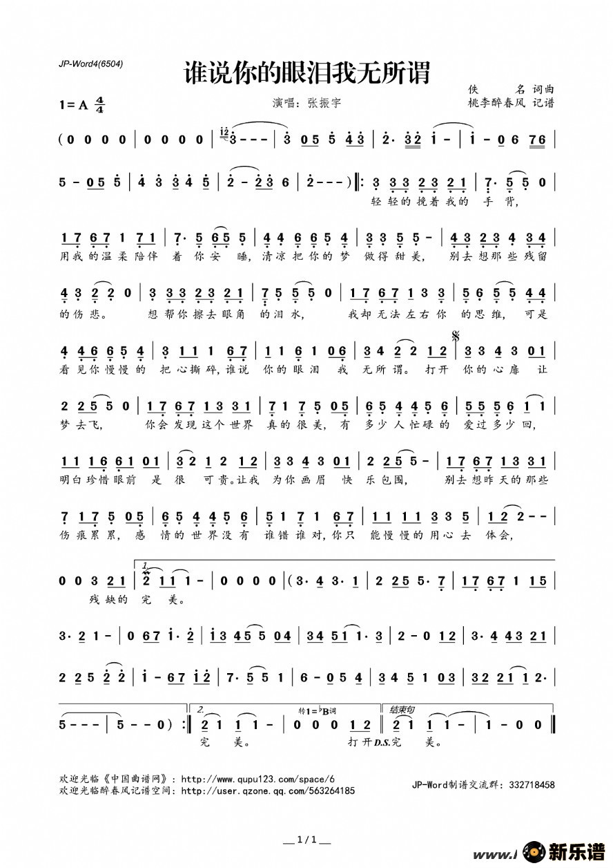 谁说你的眼泪我无所谓/张振宇 相关曲谱