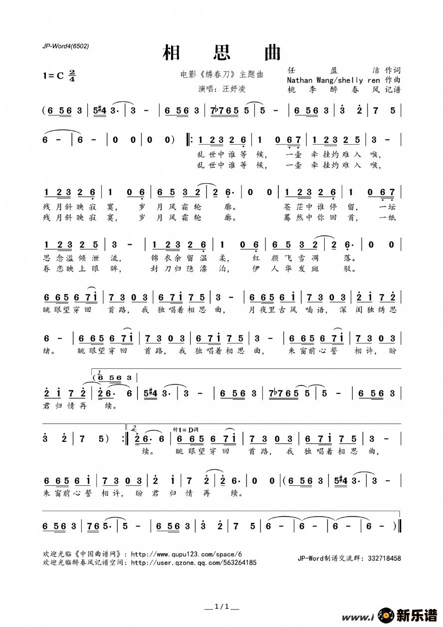汪妤凌演唱的相思曲歌词,相思曲简谱.