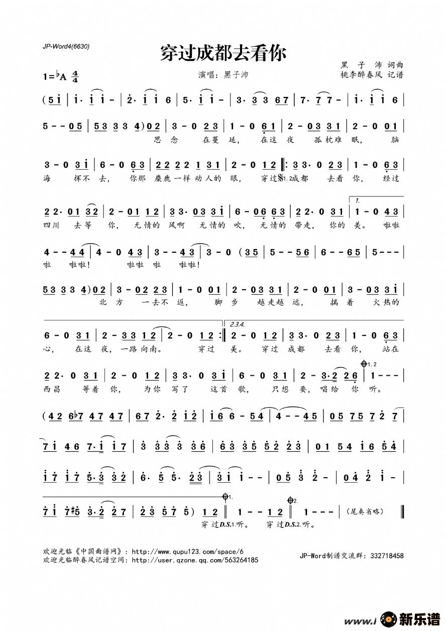 黑子沛演唱的穿过成都去看你歌词,穿过成都去看你简谱.