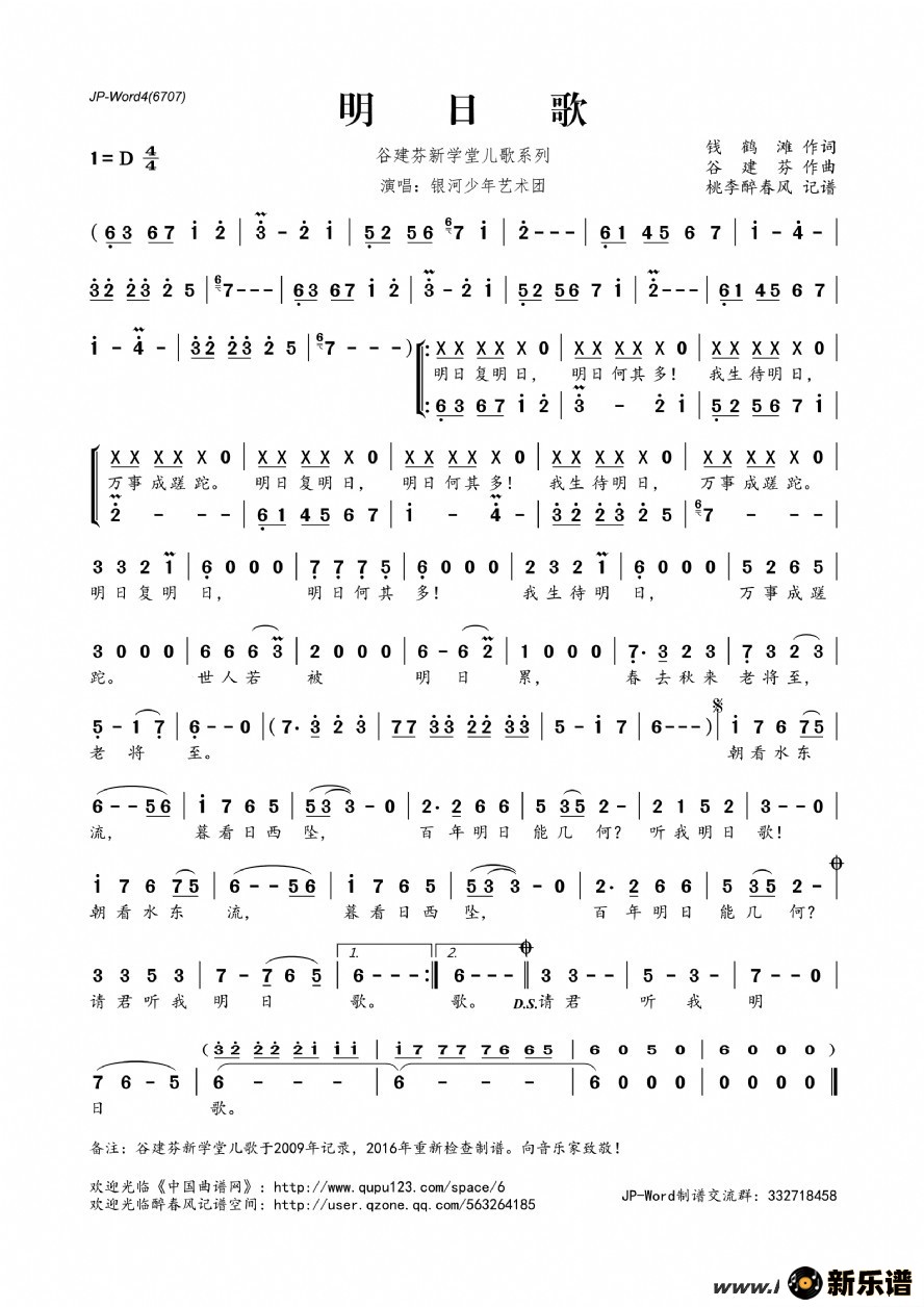 银河少年艺术团演唱的谷建芬新学堂儿歌系列:明日歌歌词,谷建芬新学堂儿歌系列:明日歌简谱.