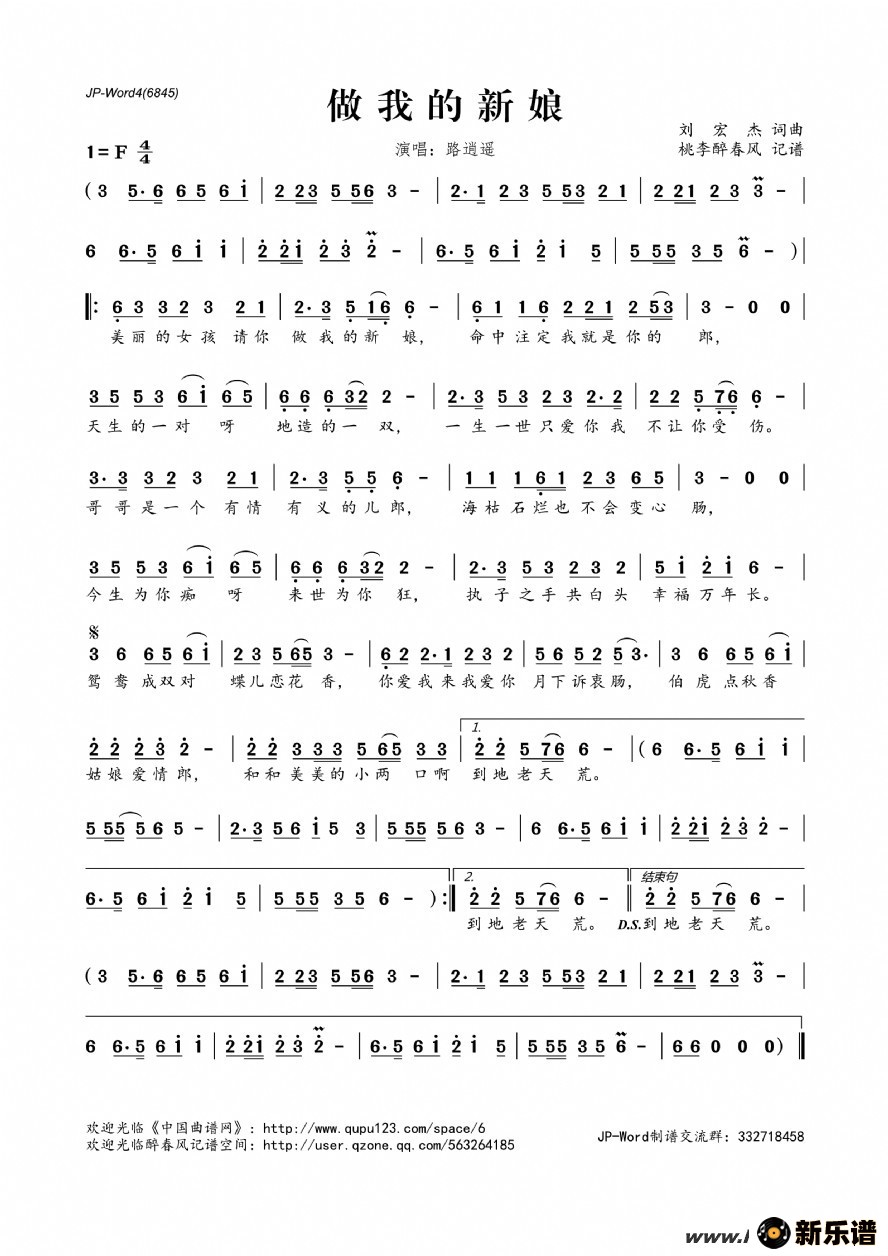 《做我的新娘》简谱 路逍遥-桃李醉春风制谱