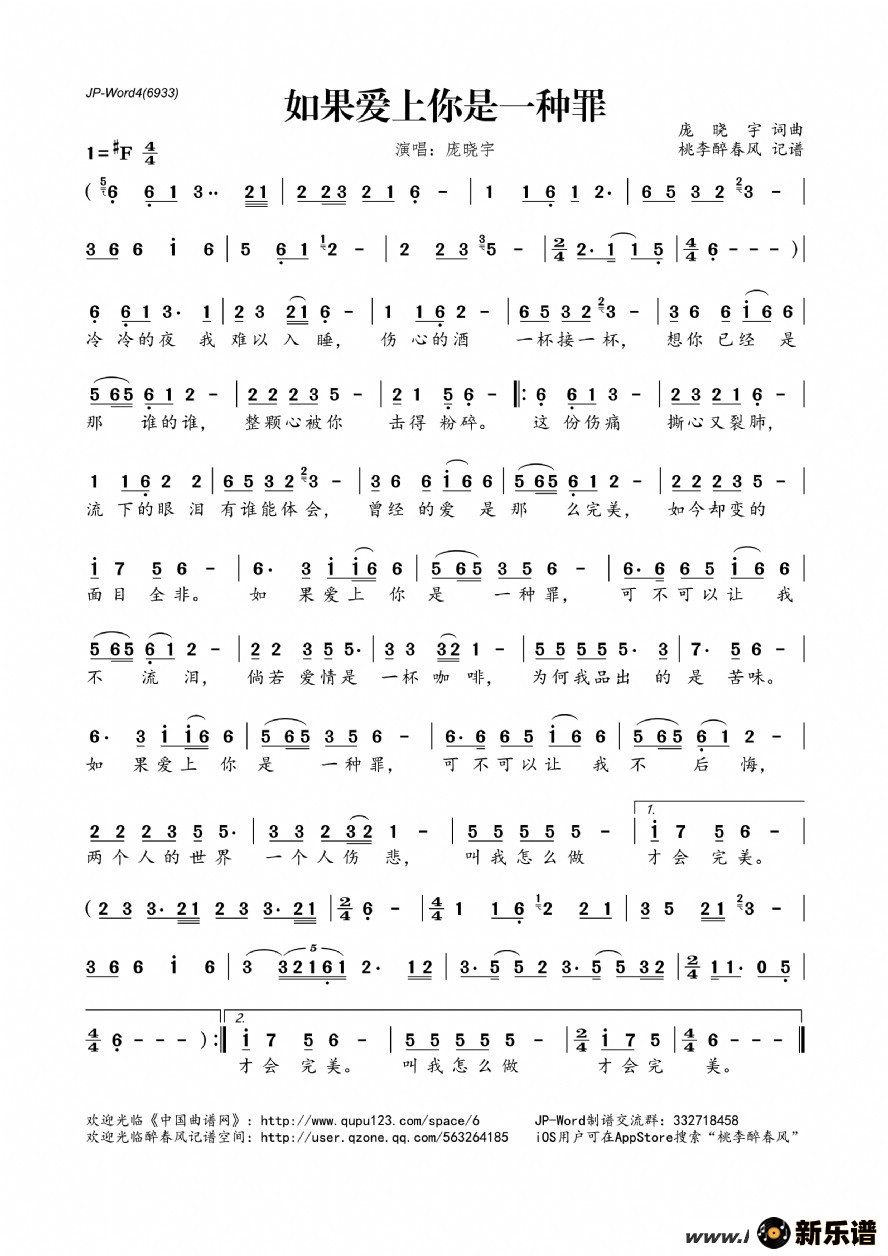 《如果爱上你是一种罪》简谱 庞晓宇-桃李醉春风制谱