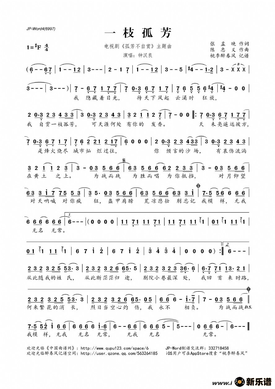 《一枝孤芳(电视剧《孤芳不自赏》主题曲)》简谱 钟汉良-桃李醉春风制谱