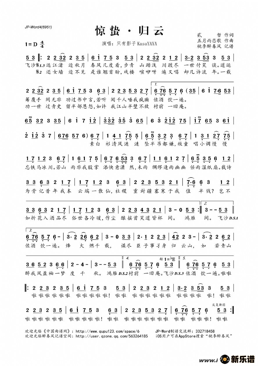 只有影子/kasayaya演唱的归云·惊蛰歌词,归云·惊蛰简谱.