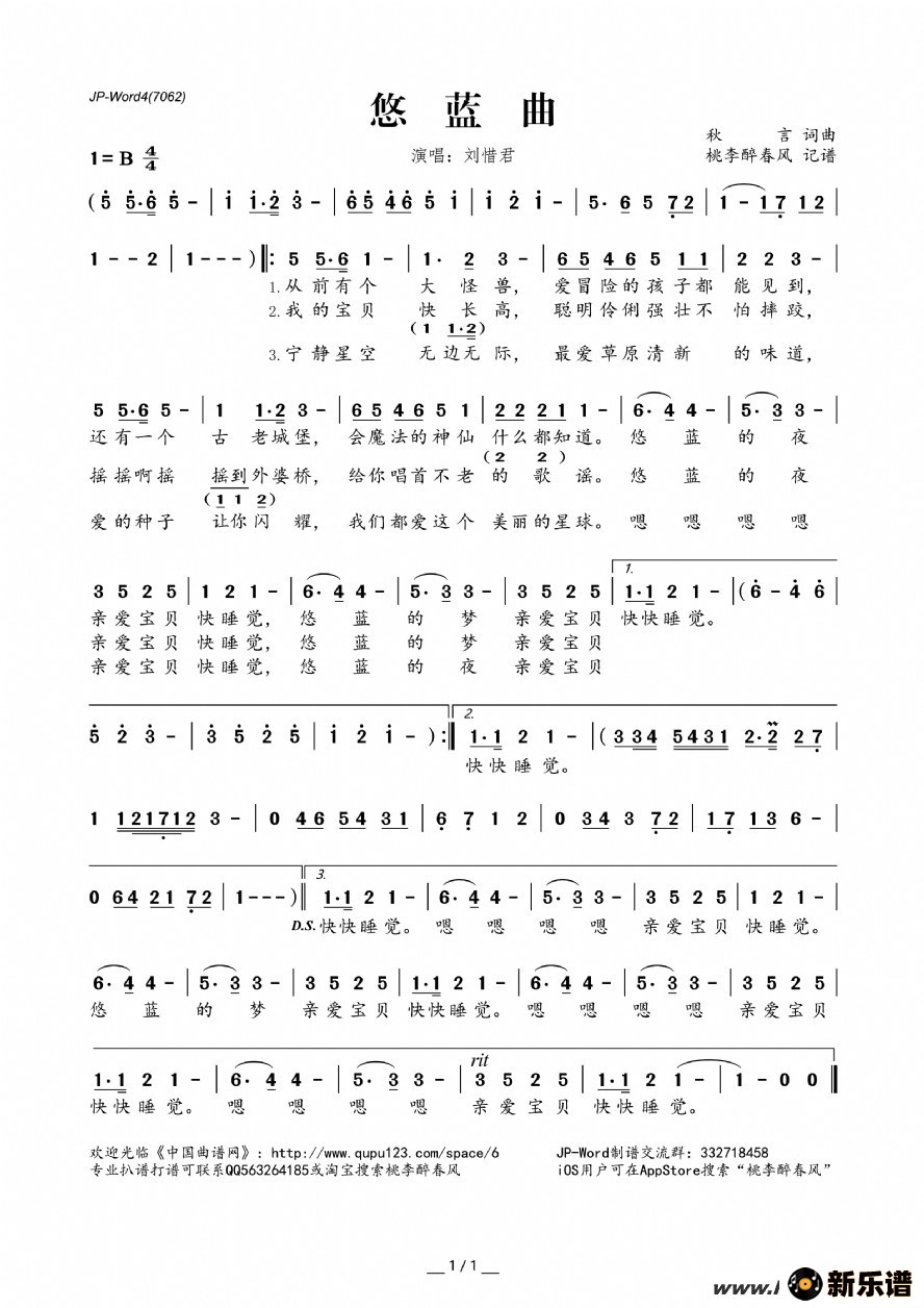 《悠蓝曲》简谱 刘惜君-桃李醉春风制谱
