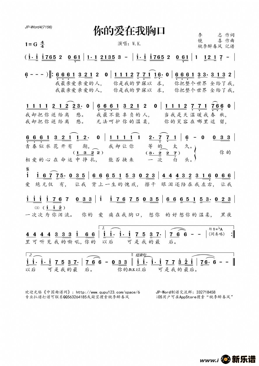 《你的爱痛在我胸口》简谱 W.K.-桃李醉春风制谱