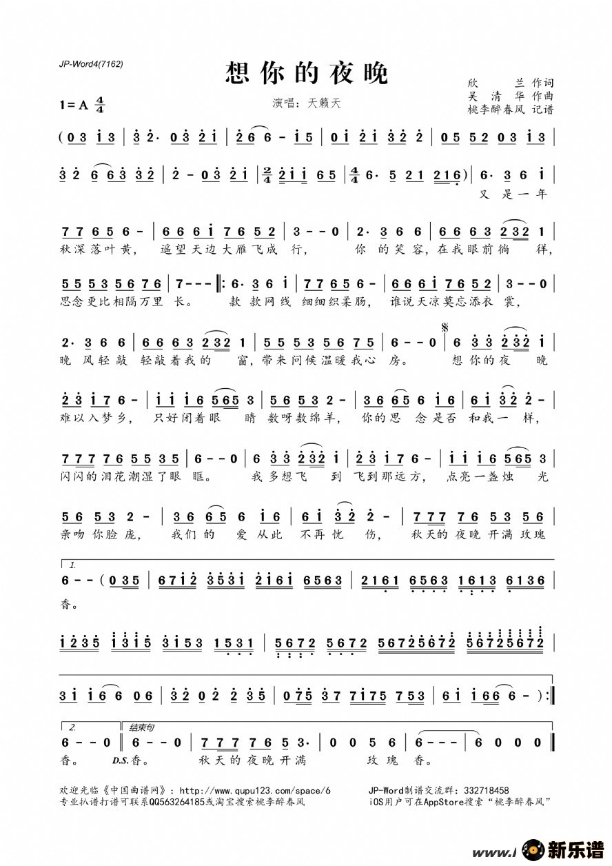 天籁天演唱的想你的夜晚歌词,想你的夜晚简谱.