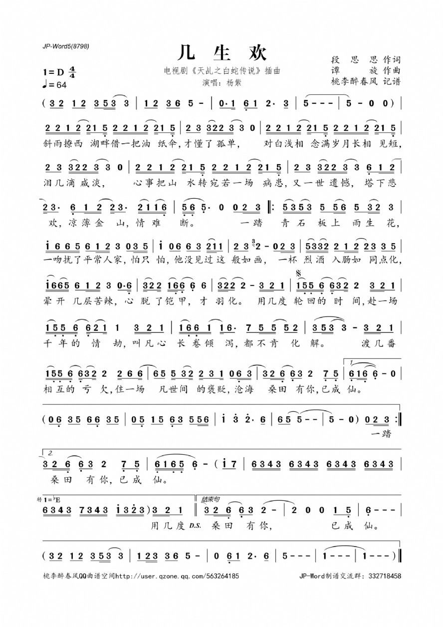 杨紫演唱的几生欢(电视剧《天乩之白蛇传说》插曲)歌词,几生欢(电视剧《天乩之白蛇传说》插曲)简谱.