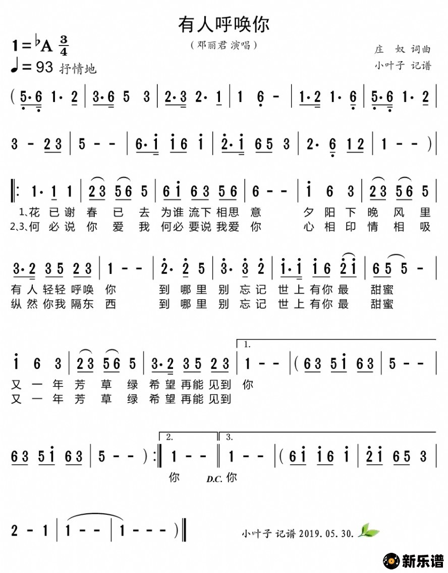 《有人呼唤你》简谱 邓丽君-小叶子制谱