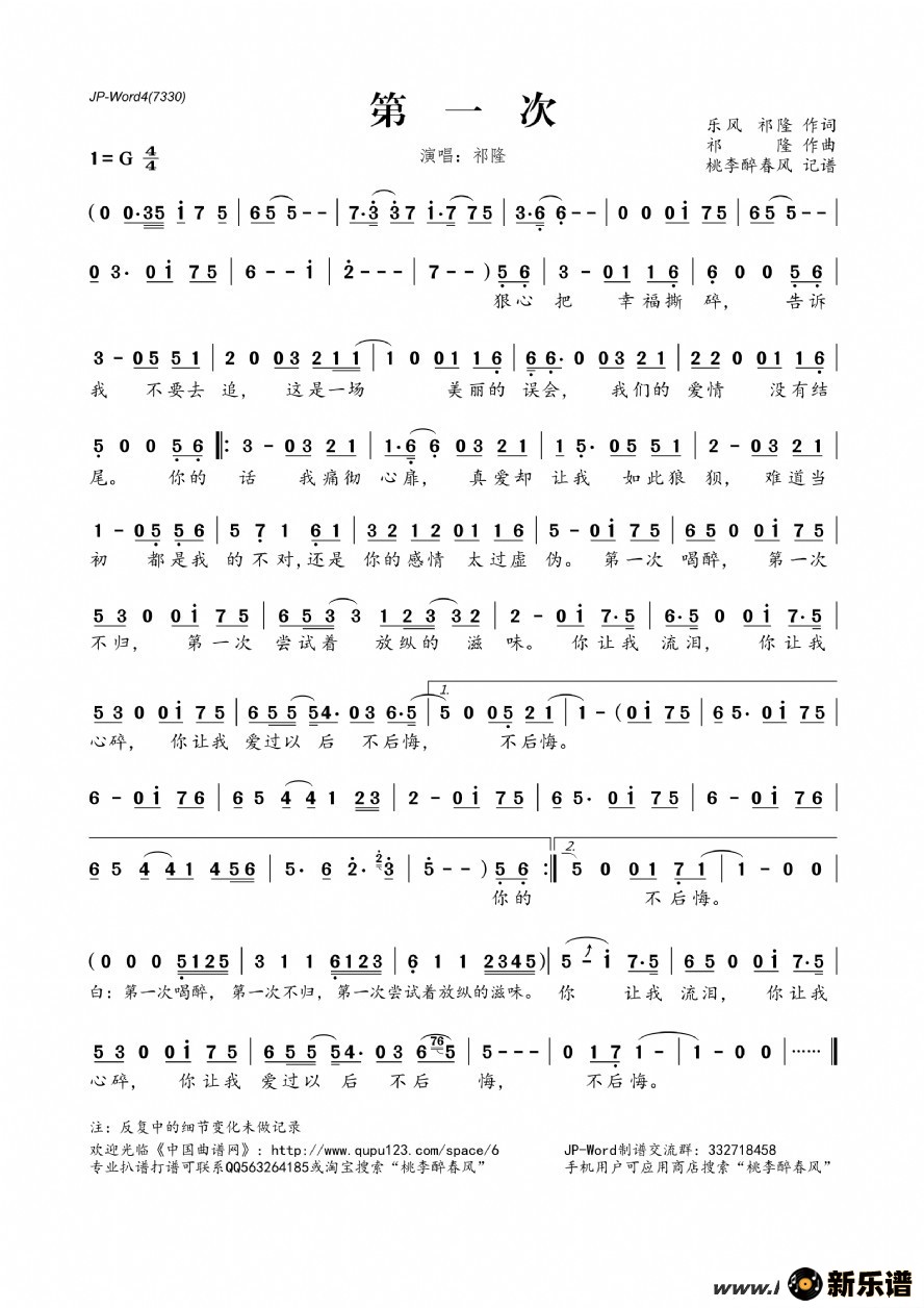 《第一次》简谱 祁隆-桃李醉春风制谱