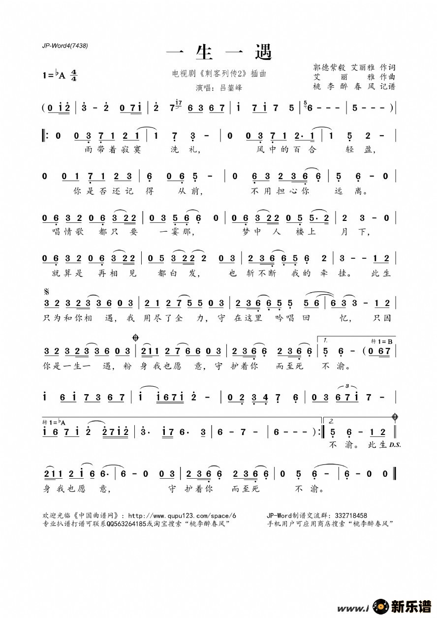 《一生一遇(电视剧《刺客列传2》插曲)》简谱 吕鋆峰-桃李醉春风制谱